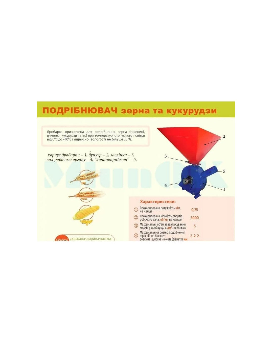 Kruszarka do zboża „Młynok” przeznaczona jest do przygotowania paszy poprzez mielenie ziarna dla zwierząt domowych i ptaków. Surowcem do rozdrabniaczy ziarna jest dowolne ziarno, w tym kukurydza, a także kolby kukurydzy. W całości wykonany z wysokiej jakości metalu krajowego.