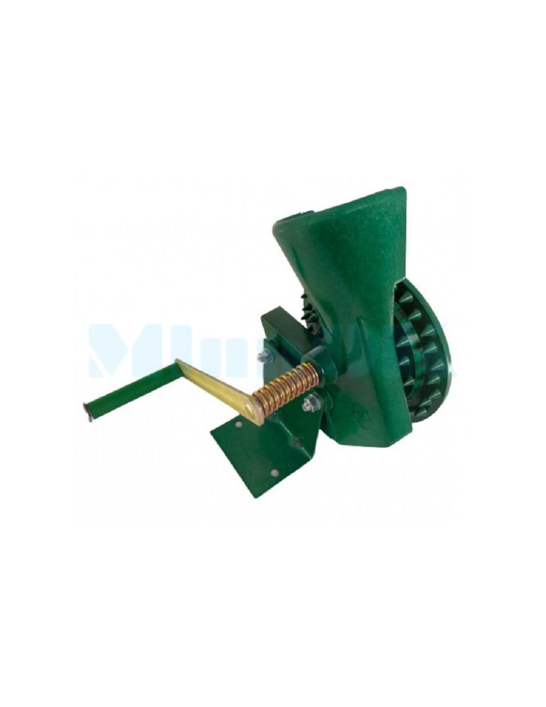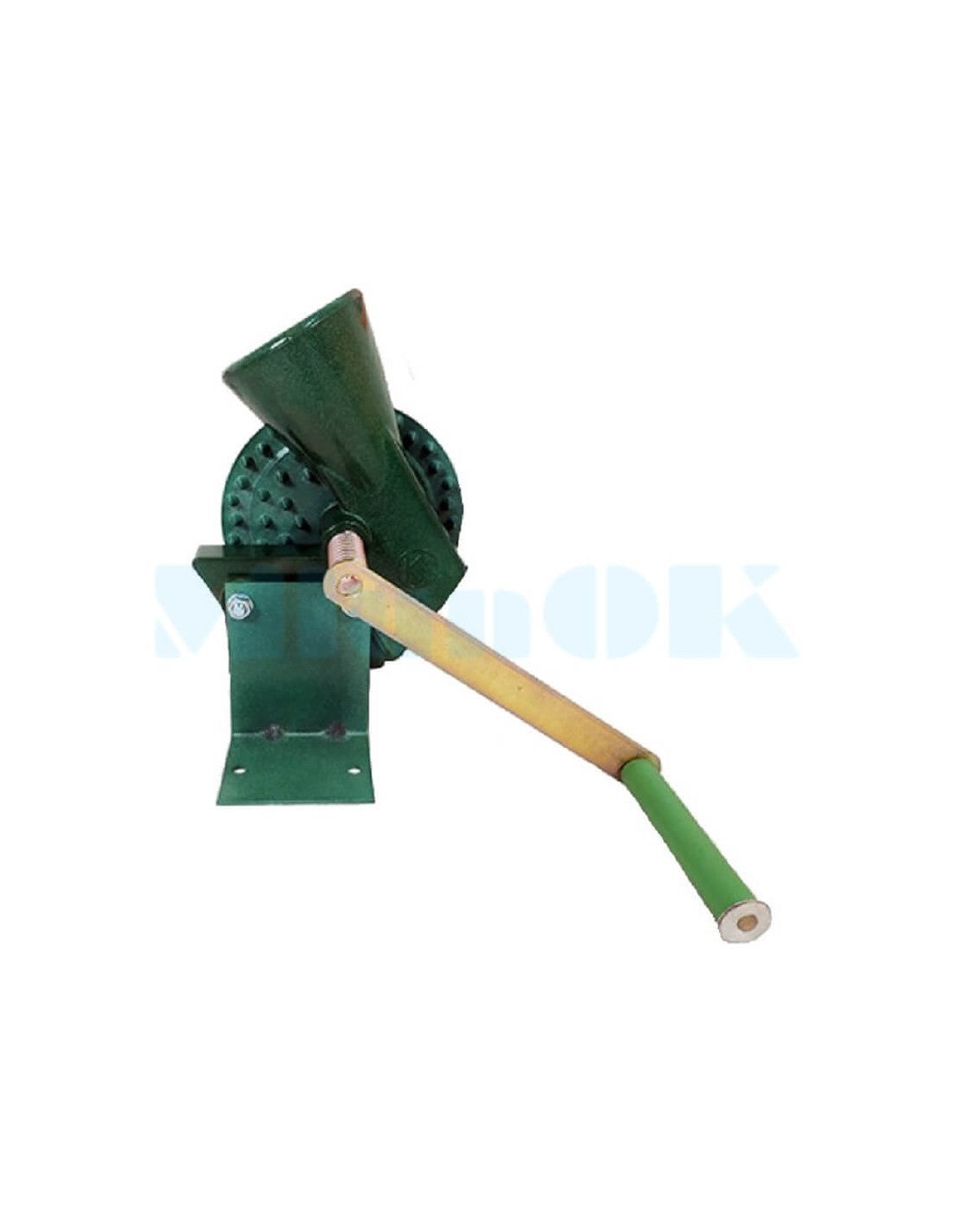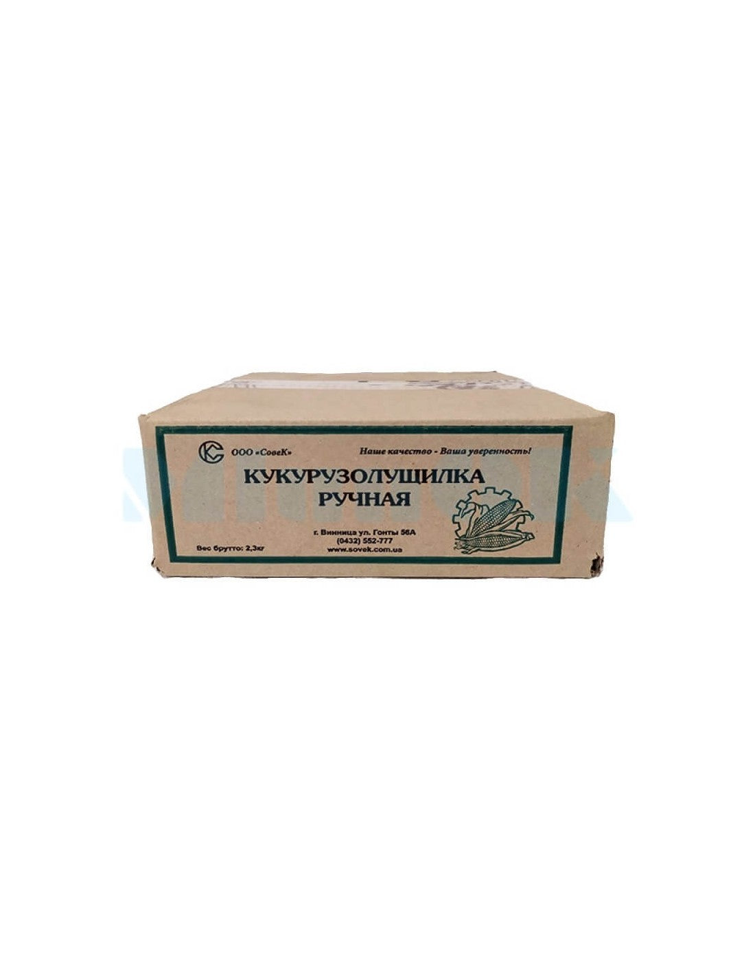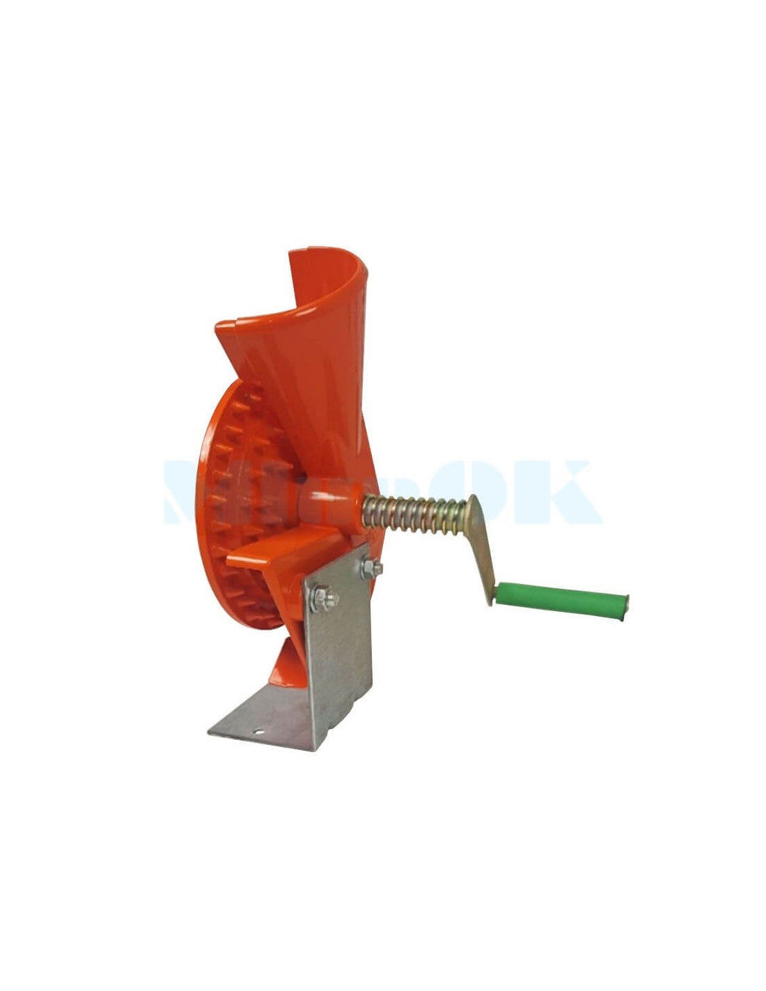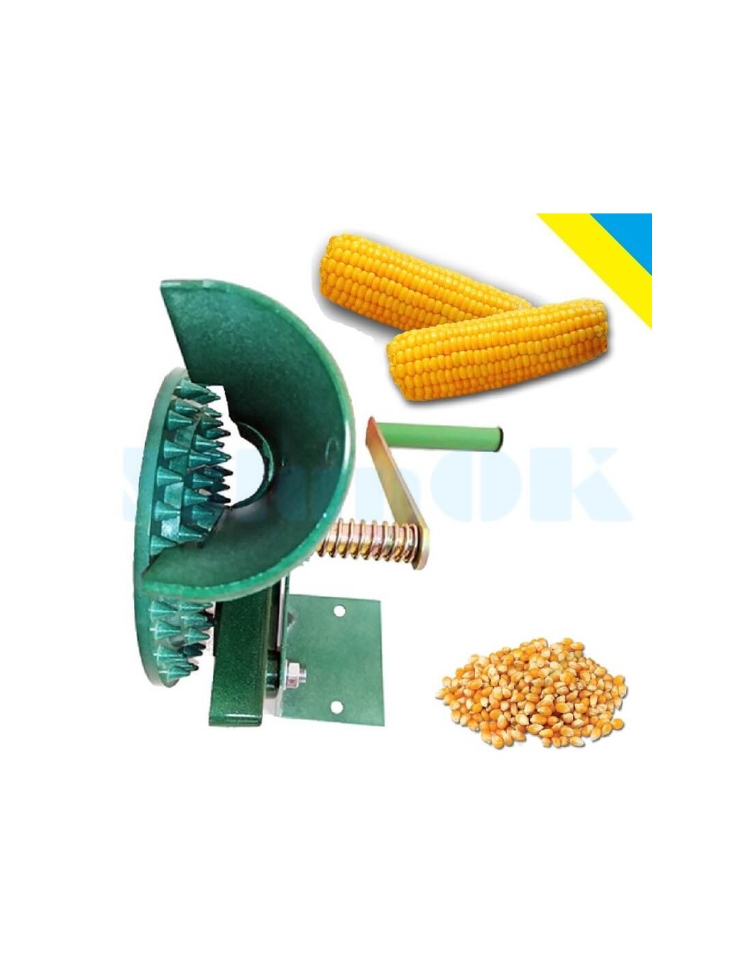 Ręczna obieraczka do kukurydzy, łatwa w obsłudze i niezawodna w działaniu. Mocowany na krawędzi stołu, krzesła lub łóżka. Rękojeść obraca się ręcznie, z której obraca się dysk z metalowymi kolcami. Kolby kukurydzy podawane są od góry i po zetknięciu się z krążkiem kolce oddzielają ziarna. Wydajność wynosi około 100 kg na godzinę.