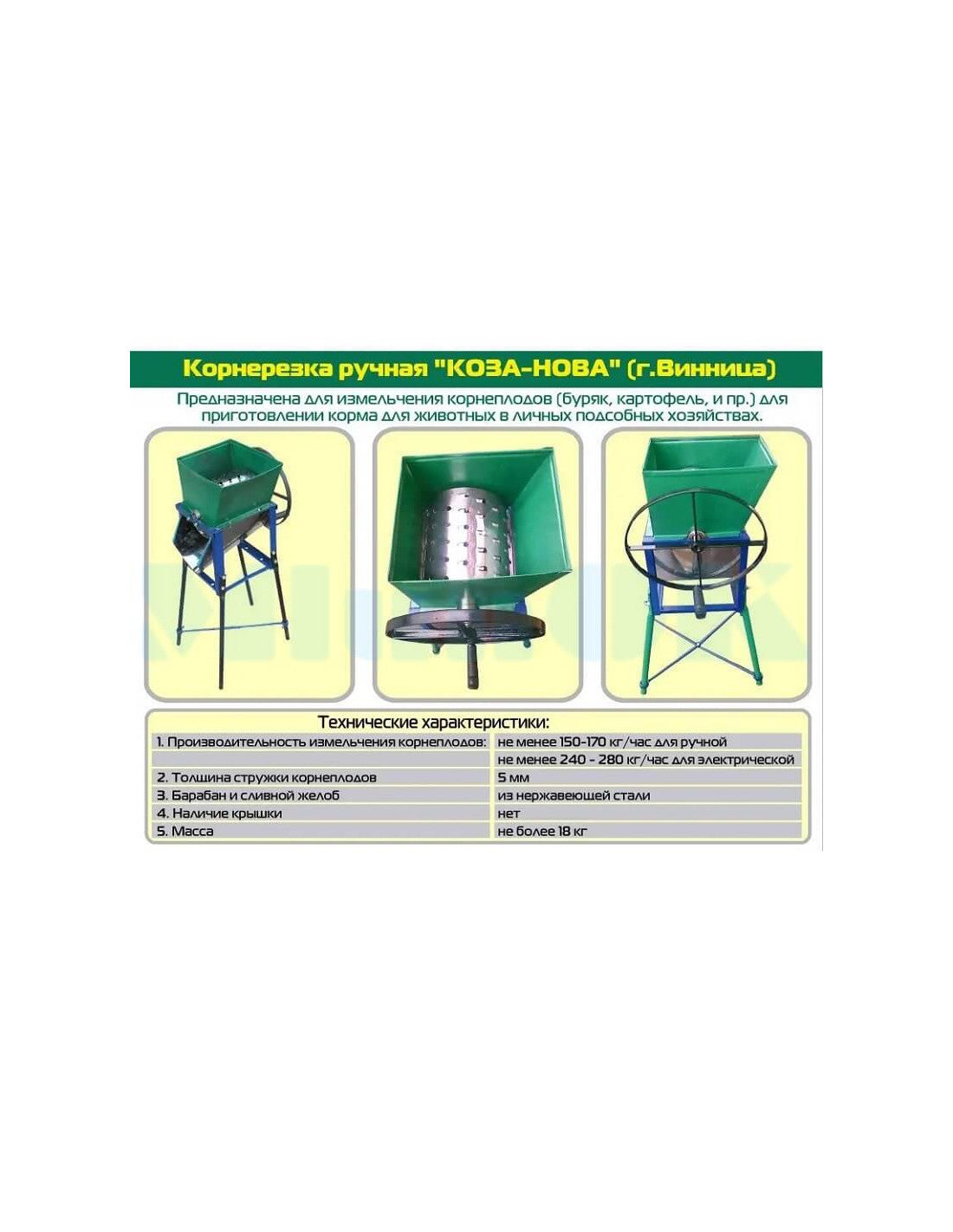 Ręczny rozdrabniacz do warzyw i owoców przeznaczony jest do stosowania w gospodarstwach domowych i gospodarstwach rolnych do wysokiej jakości i szybkiego siekania roślin okopowych, warzyw i owoców na potrzeby przygotowania paszy dla zwierząt i drobiu. Posiada tarkę bębnową z ostrymi zębami. Surowiec ładowany jest od góry, rozdrobniony surowiec wyrzucany jest z dolnej części rozdrabniacza. Działa ręcznie i posiada wygodny uchwyt. Wyposażone w specjalne wygodne nóżki.