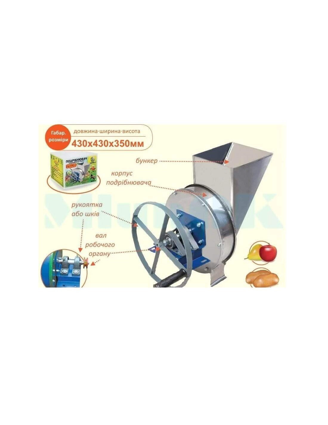 Ręczny rozdrabniacz do warzyw i owoców przeznaczony jest do stosowania w gospodarstwach domowych i gospodarstwach rolnych do wysokiej jakości i szybkiego siekania warzyw korzeniowych, warzyw i owoców na potrzeby przygotowania paszy dla zwierząt, drobiu lub dalszego przetwarzania produktów. Można go używać do siekania jabłek na sok do wyciskania na specjalnej prasie, a także do siekania winogron do produkcji domowego wina.