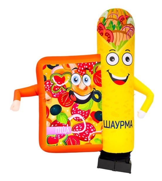 Turn hungry passersby into customers with a playful, waving mascot featuring a pizza slice and shawarma wrap. The tall, kinetic figure runs continuously with a built-in blower—perfect for pizzerias, street kitchens, fast-food stands, food trucks, markets, festivals, and grand openings across the EU and USA.